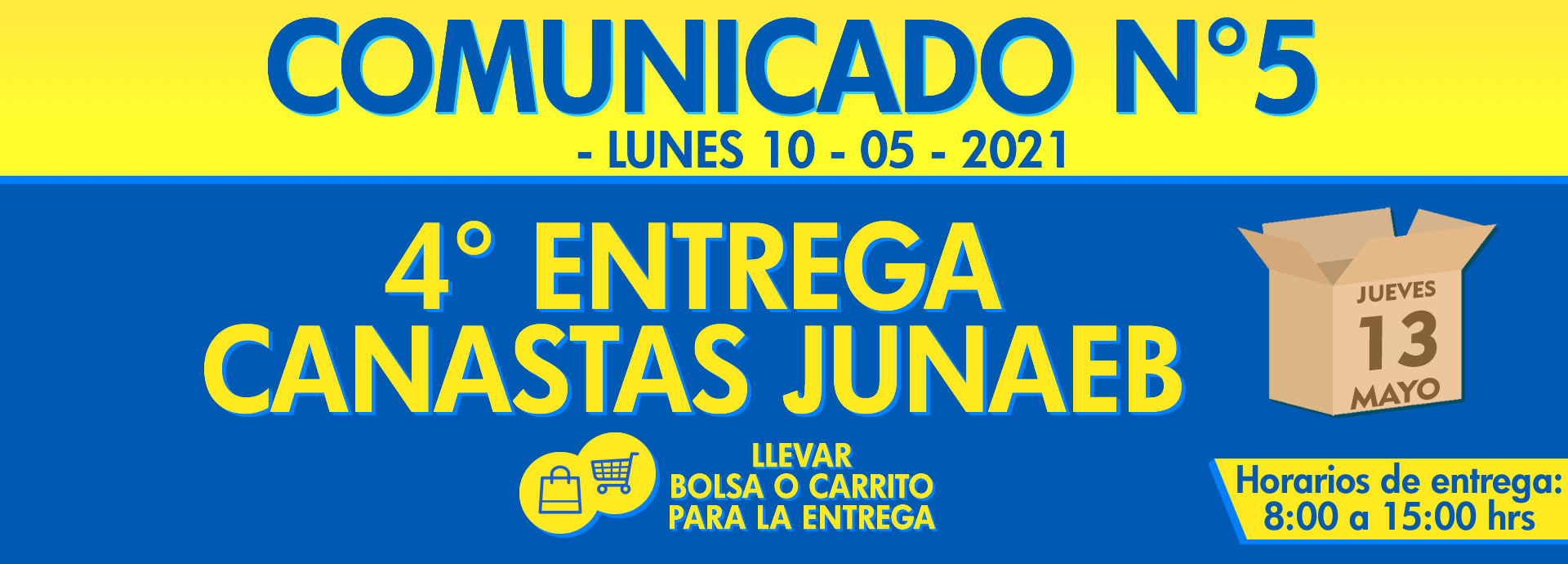 El día jueves, 13 de Mayo, (FECHA ÚNICA), se entregará el tercer ciclo de canastas de alimentos JUNAEB, a los estudiantes beneficiarios. El colegio se comunicará con la familia vía mensaje de texto (mensajería Syscol) e email institucional del estudiante llegando la información directamente a su celular y correo electrónico.
